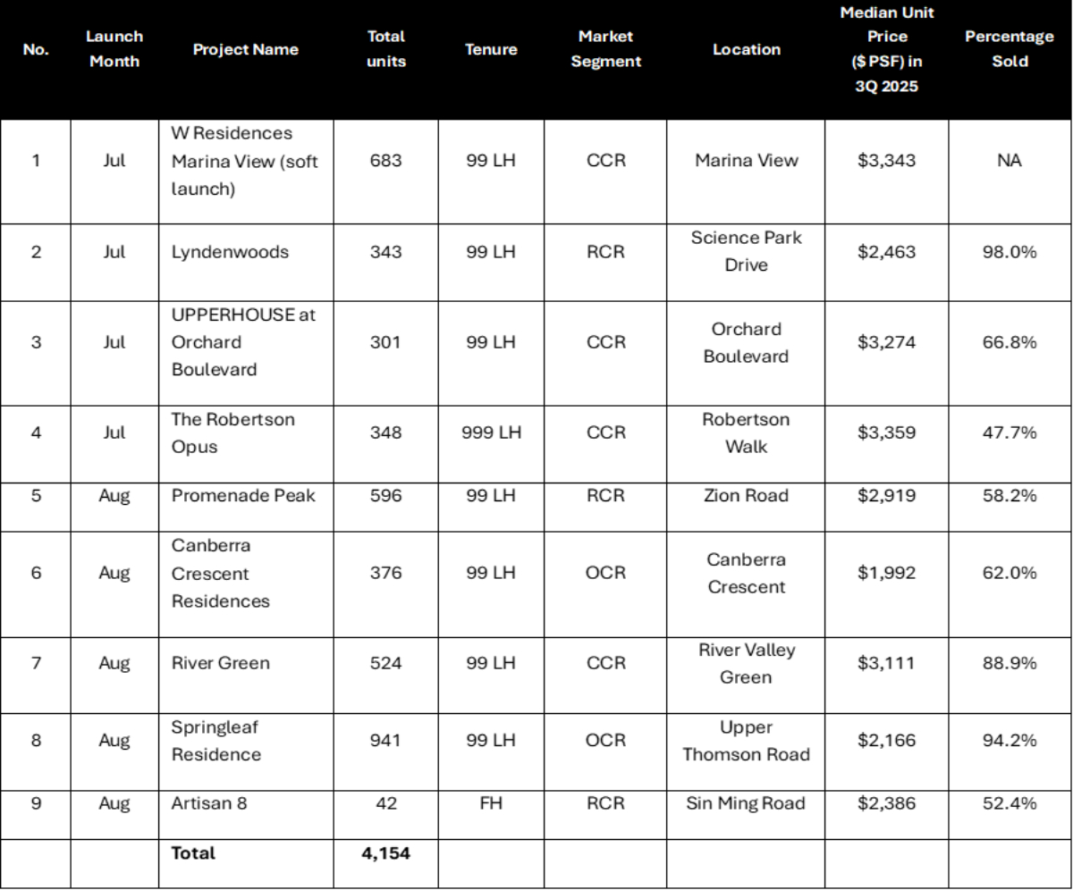 In 3Q 2025, some nine new private home launches (totalling 4,154 units) across various estates in Singapore, catering to a diverse range of buyer needs. In particular, the CCR is set to see four new launches in 3Q 2025, following a relatively quiet pipeline in recent years. Come 4Q 2025, sales momentum is set to continue with five new launches slated to add another 2,578 units.
