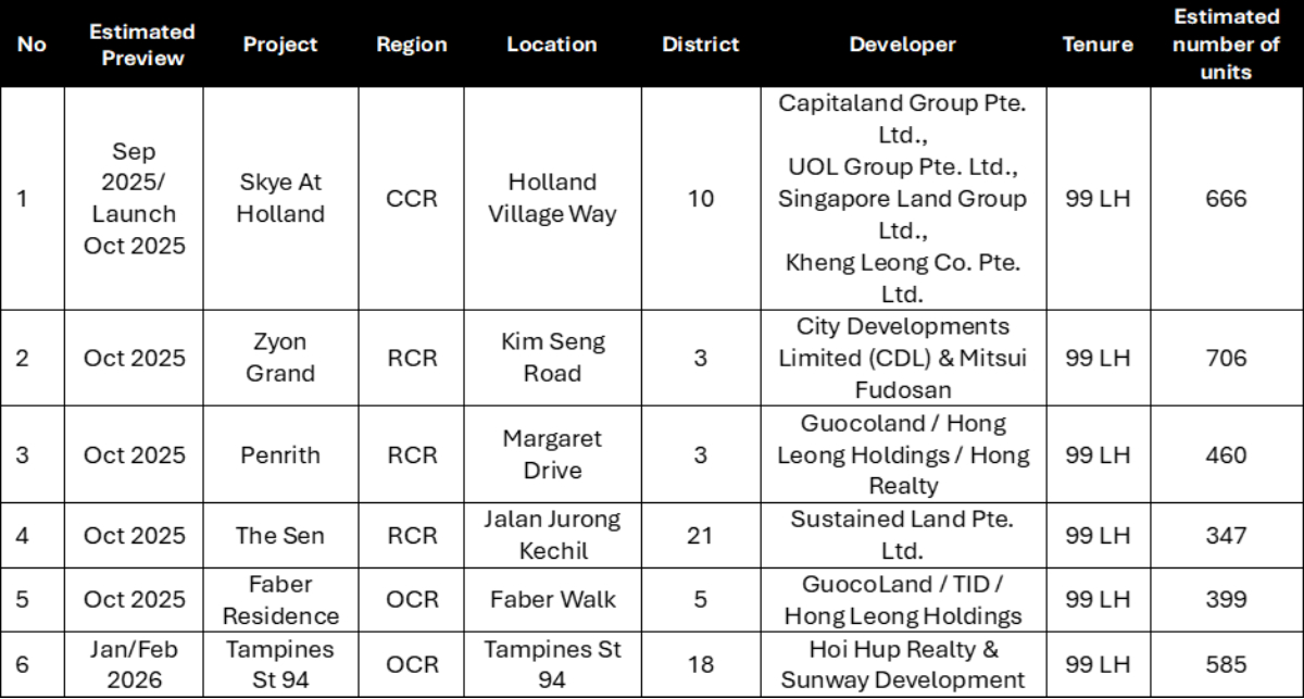 In 4Q 2025, five new projects are expected to launch in popular housing estates such as Queenstown, Clementi and Holland, and Zion Road. These projects, Penrith, Skye at Holland, Zyon Grand, The Sens, and Faber Residence, are expected to draw keen buyers’ interest as some of these precincts have not seen new launches in years.
