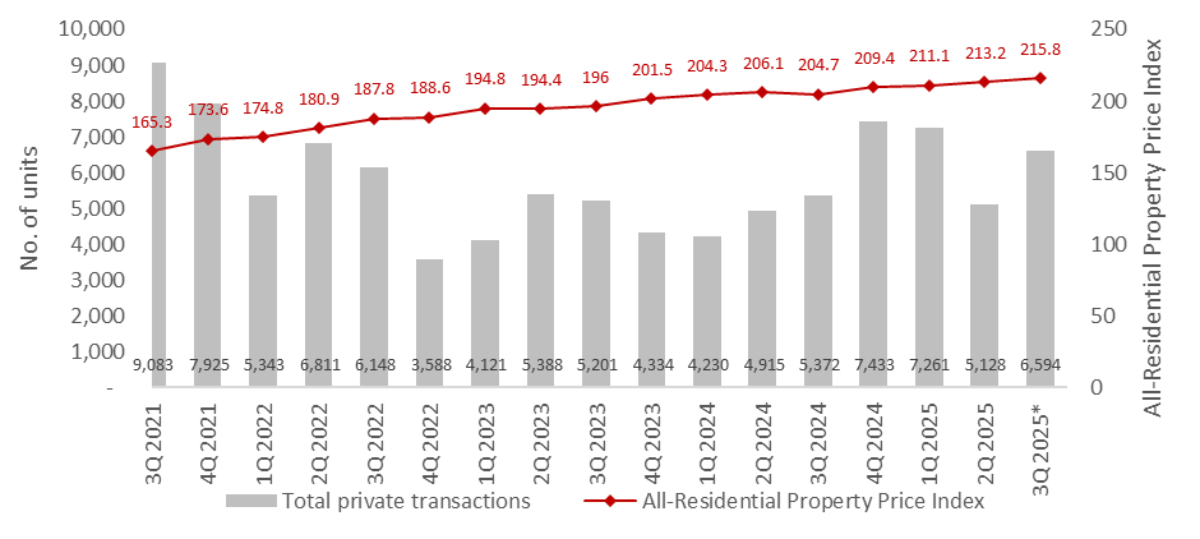 According to flash estimates released by the Urban Redevelopment Authority (URA) for 3Q 2025, the All-Residential Property Price Index exhibited a modest increase of 1.2% quarter-on-quarter (q-o-q), while the total transaction volume of private homes rose 28.6% q-o-q to 6,594 units.