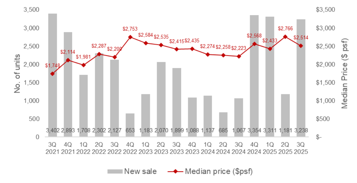 According to caveats as at 30 September 2025, new sale transactions saw a rebound by 174.2% q-o-q to 3,238 units in 3Q 2025. This steep increase came on the back of nine new launches in 3Q 2025, yielding a total of 4,154 units.