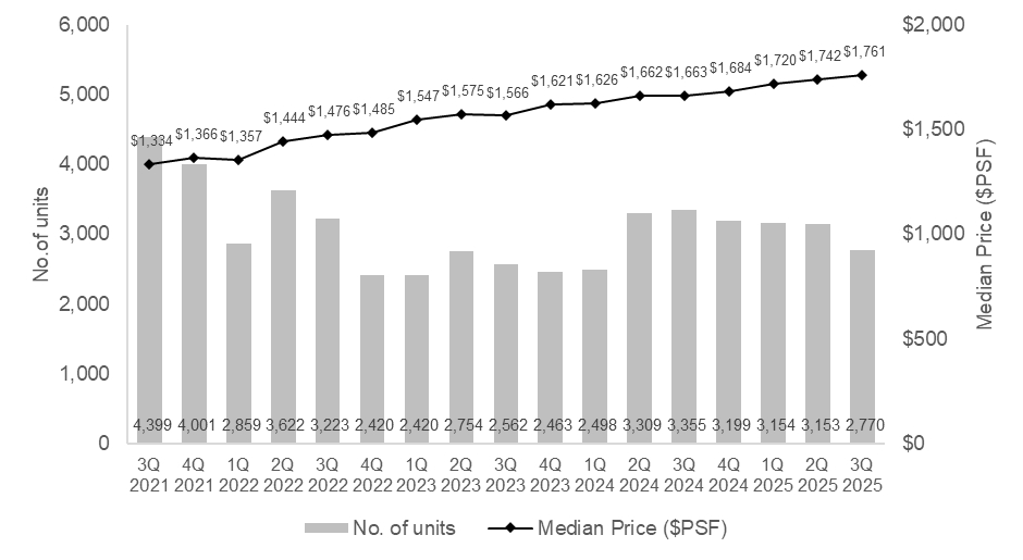 In contrast to the downtick in transaction volume, median unit prices for resale non-landed private properties (excluding ECs) rose 1.1% q-o-q to $1,761 psf in 3Q 2025. This measured rise reflects stable growth in the segment. It also continues the upward momentum observed since 4Q 2023.