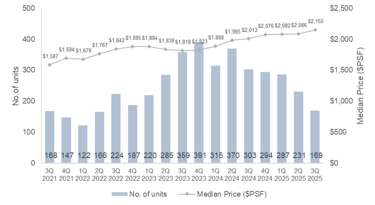 Caveat data (as at 30 Sept 2025) shows that the CCR recorded approximately 894 non-landed private home sales (excluding ECs) in 3Q 2025. This marks the highest quarterly total for the CCR in 15 years since 2Q 2010, when 1,066 units were sold.