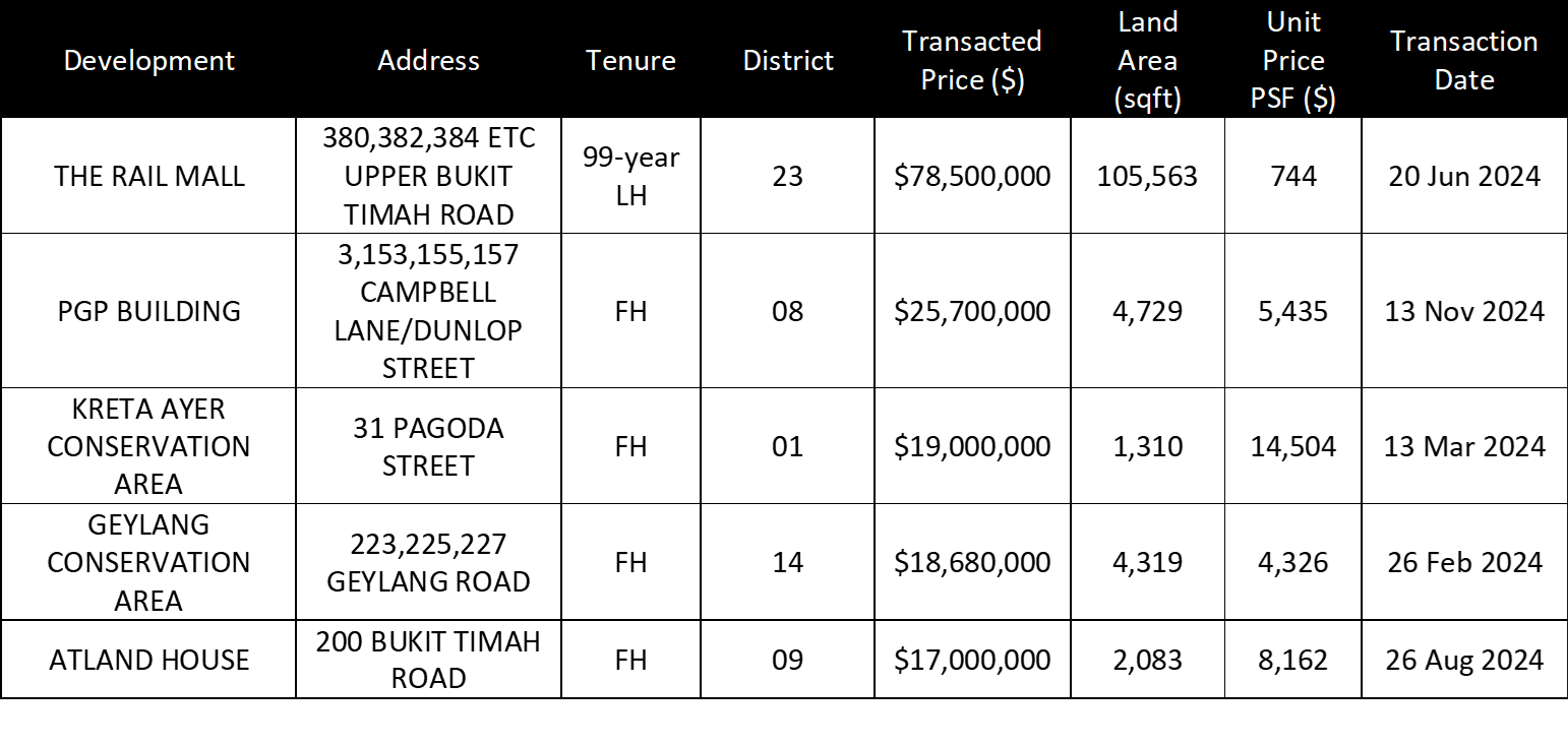 Table 1: Top five shophouse transactions in 2024
