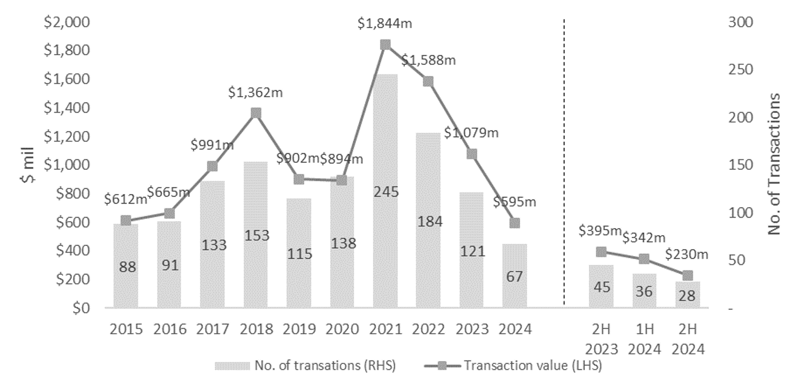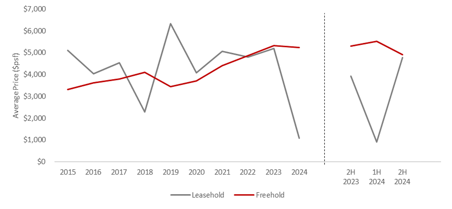 In June 2024, The Rail Mall was divested by Paragon REIT to a private investor for $78.5 million ($744 psf). This led to the average price of 99-year leasehold (99-LH) landed shophouse to be significantly lower in that half-year period.