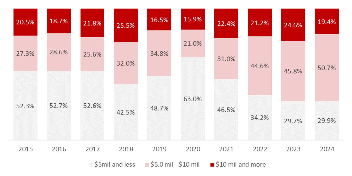 Over the past decade, the price quantum of landed shophouses has generally increased, shown by the proportion of higher valued transactions. In 2024, more than half of the shophouse transactions were between $5 million and $10 million. This could be the sweet spot for a landed shophouse. While there are shophouses transacted under $5 million, they are either not centrally located or have a 99-LH tenure.
